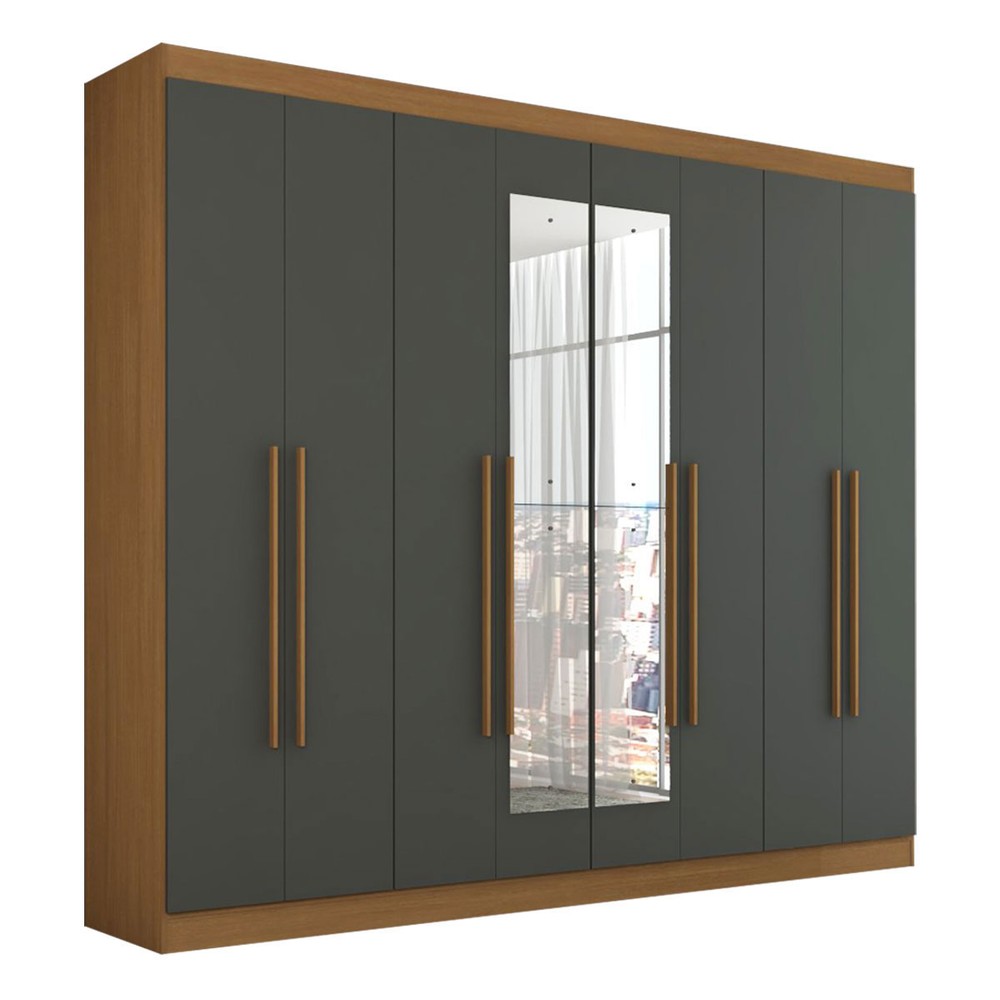 O(a) Guarda-Roupa Casal Ele e Ela 8 Portas 8 Prateleiras com Espelho Cinamomo/Chumbo - Panorama Móveis é produzido em MDP na escala de brilho Fosco, e possui um grau de dificuldade de montagem: Médio.