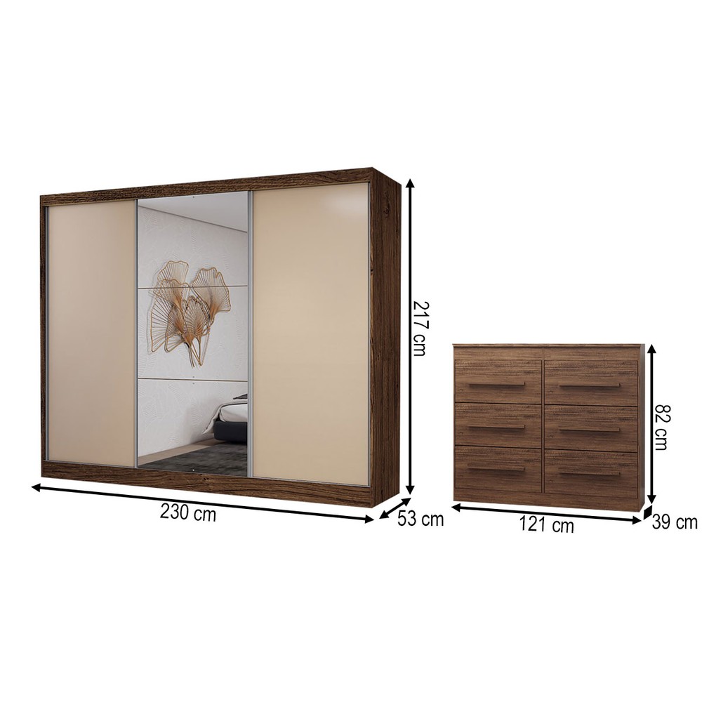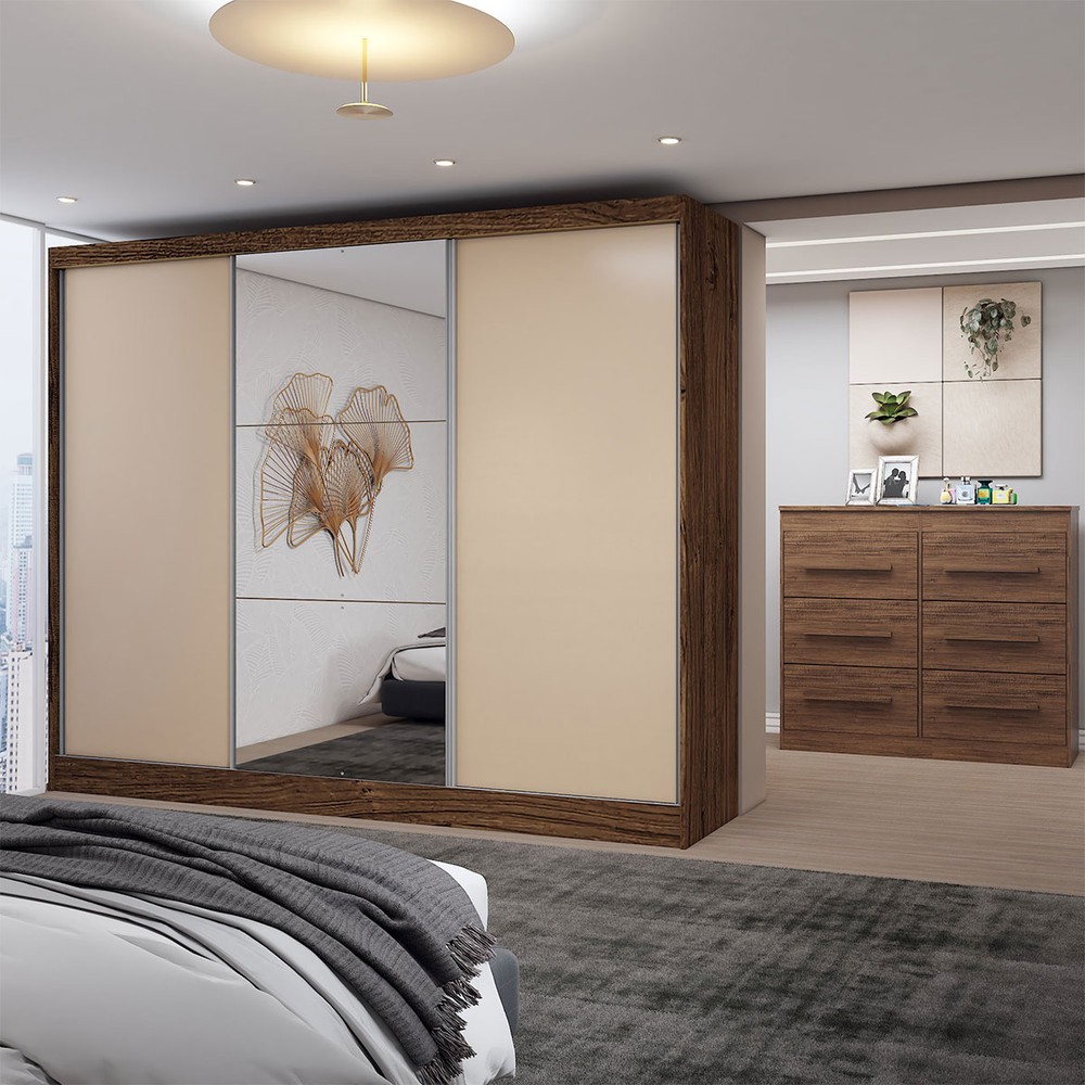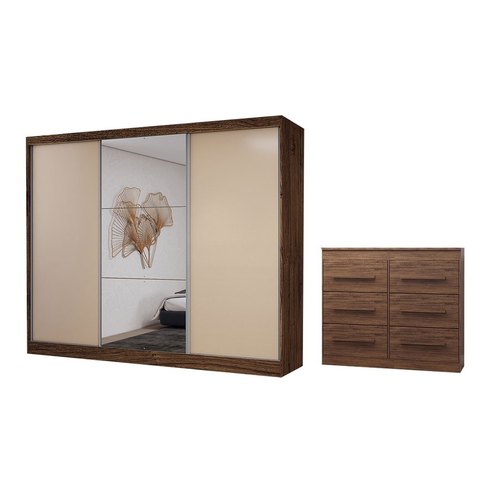 Guarda-Roupa Casal Europa 3 Portas 10 Gavetas 100% Mdf com Espelho Castanho/Nude - Panorama Móveis