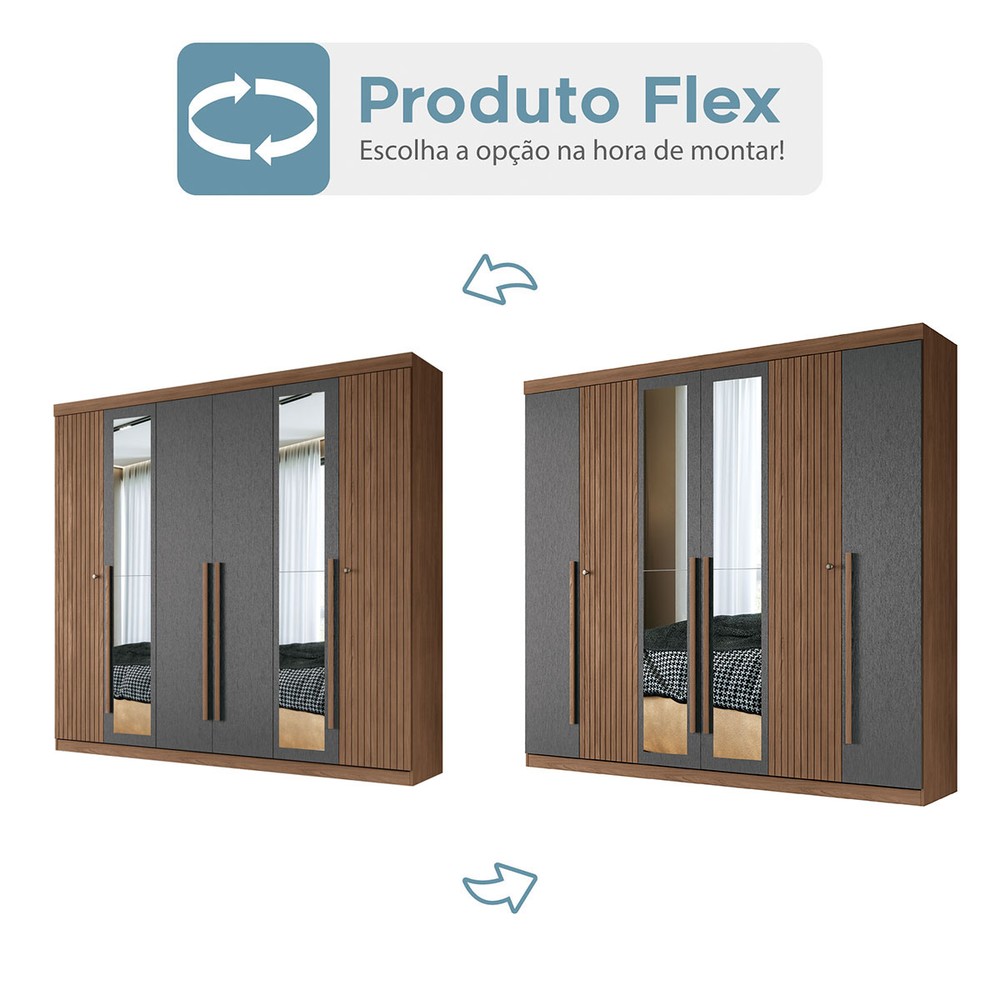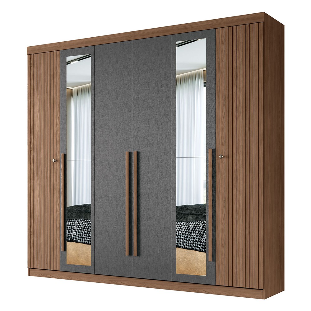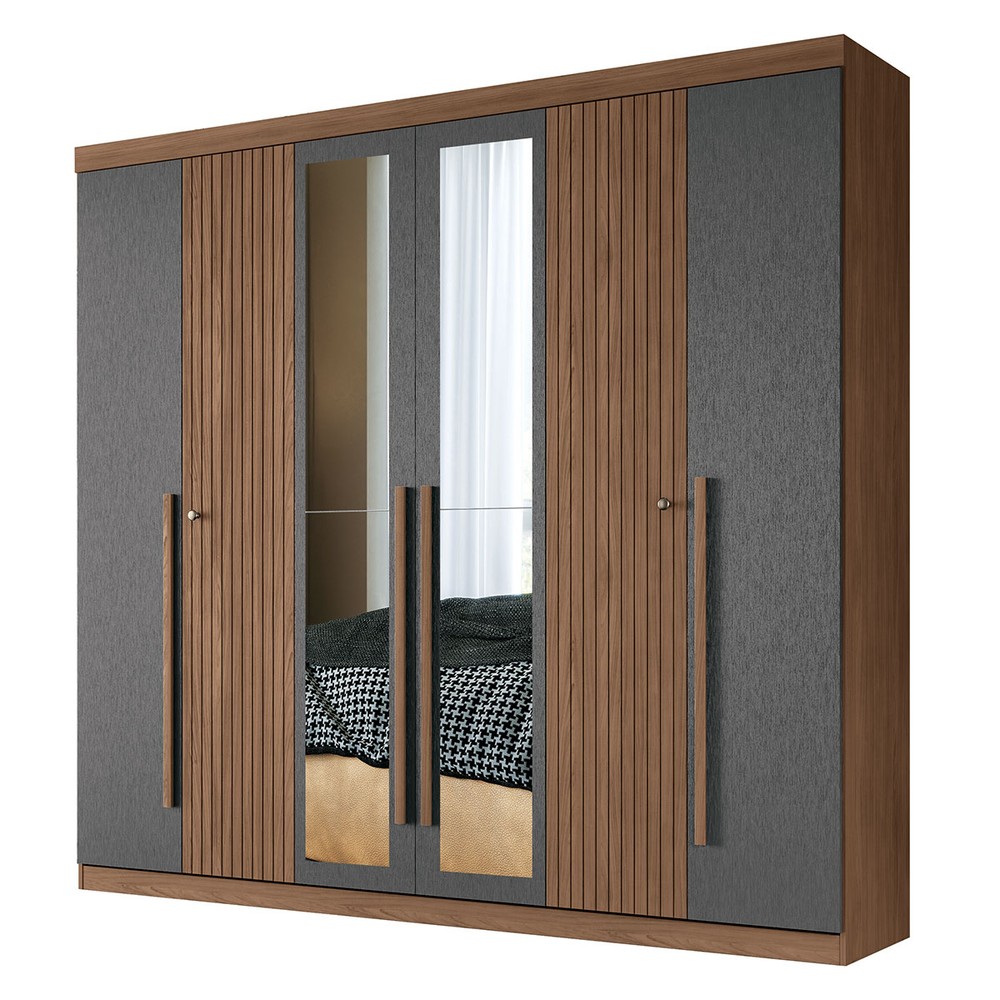 O(a) Guarda-Roupa Casal Loanda 6 Portas 4 Gavetas Ripado Jatoba/Grafite com Espelho - Pnr Móveis é produzido em MDP e HDF na escala de brilho Semi-Fosco, e possui um grau de dificuldade de montagem: Médio.