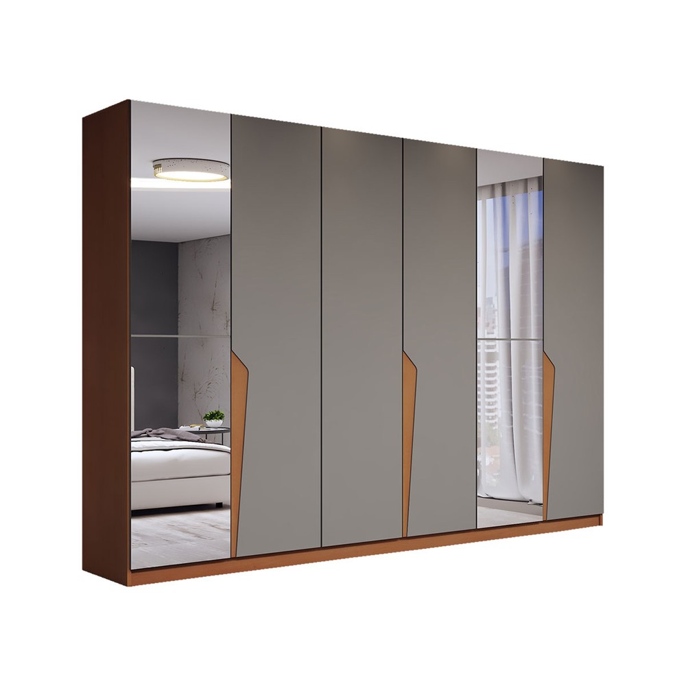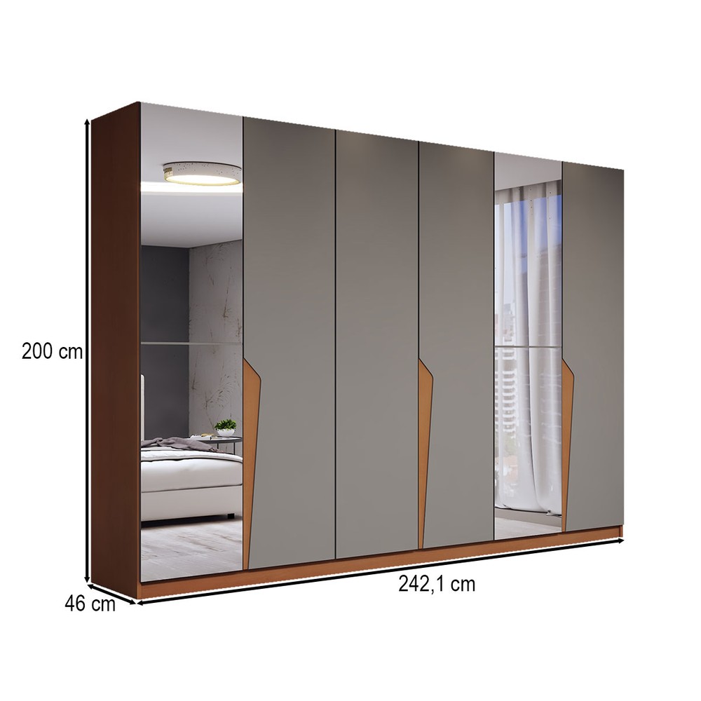 O(a) Guarda-Roupa Casal Luxe 2,42 Metros 6 Portas 4 Gavetas com Espelho Freijó/Cinza - Panorama Móveis é produzido em MDF e MDP na escala de brilho Semi-Fosco, e possui um grau de dificuldade de montagem: Médio.