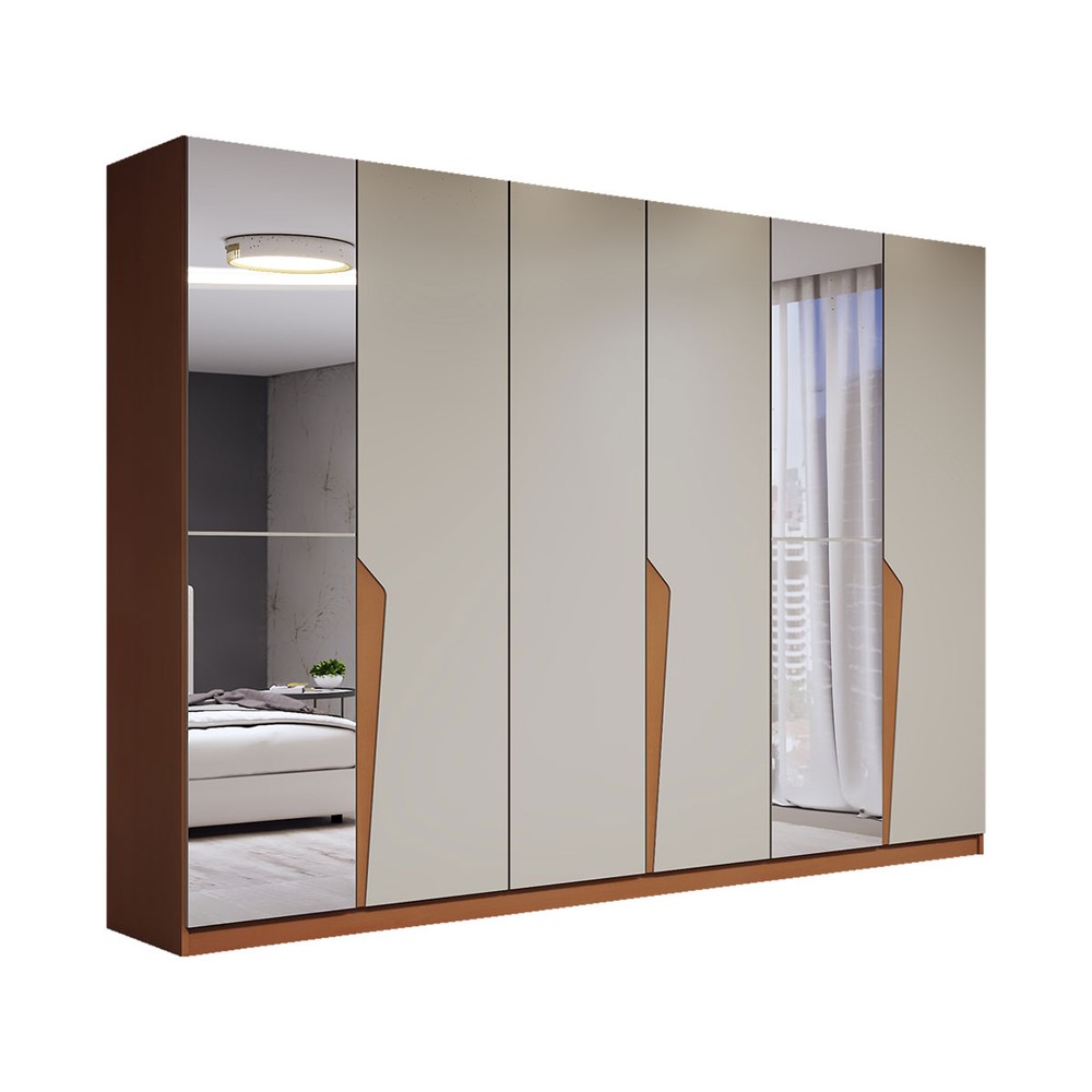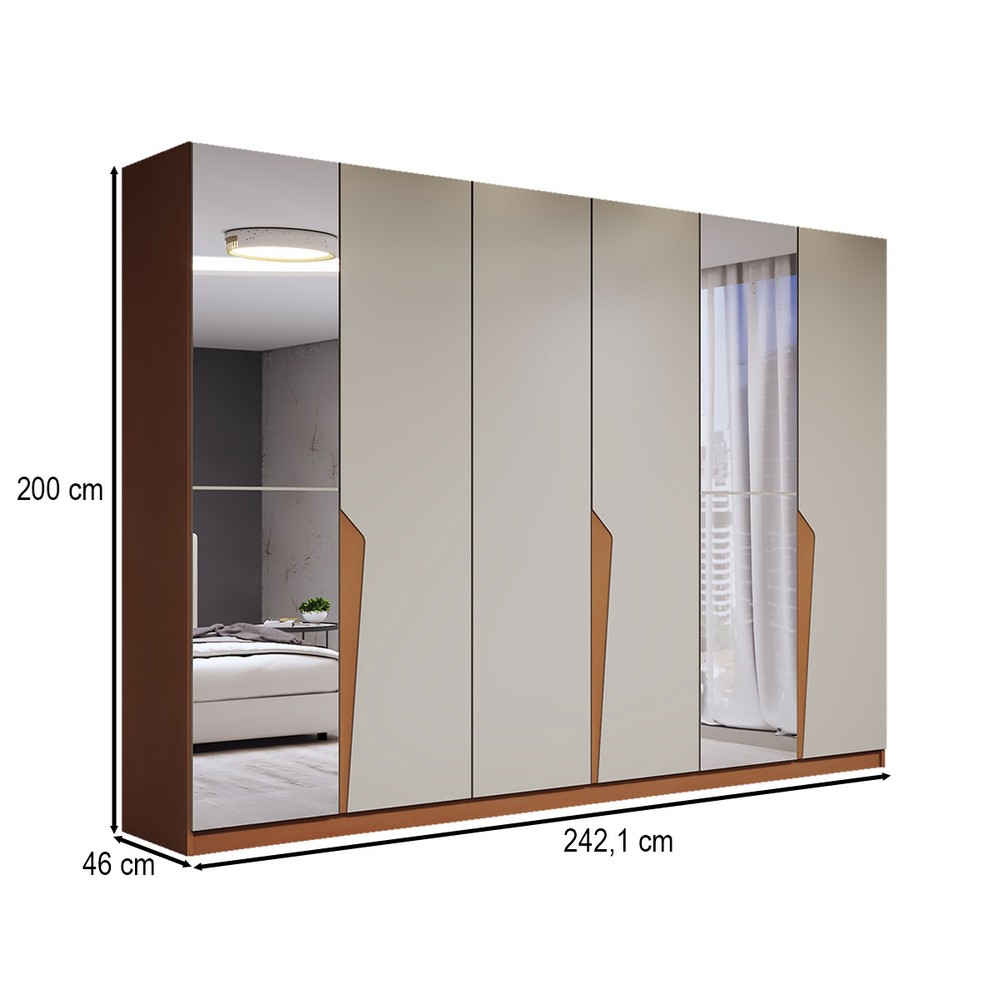O(a) Guarda-Roupa Casal Luxe 2,42 Metros 6 Portas 4 Gavetas com Espelho Freijó/Creme - Panorama Móveis é produzido em MDF e MDP na escala de brilho Semi-Fosco, e possui um grau de dificuldade de montagem: Médio.