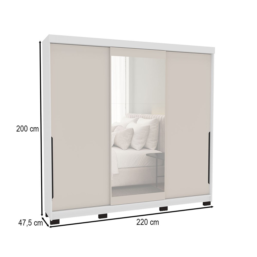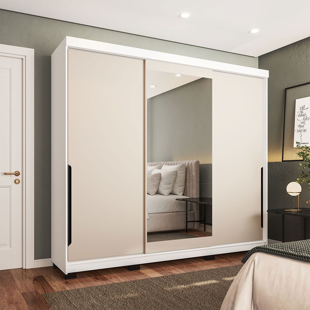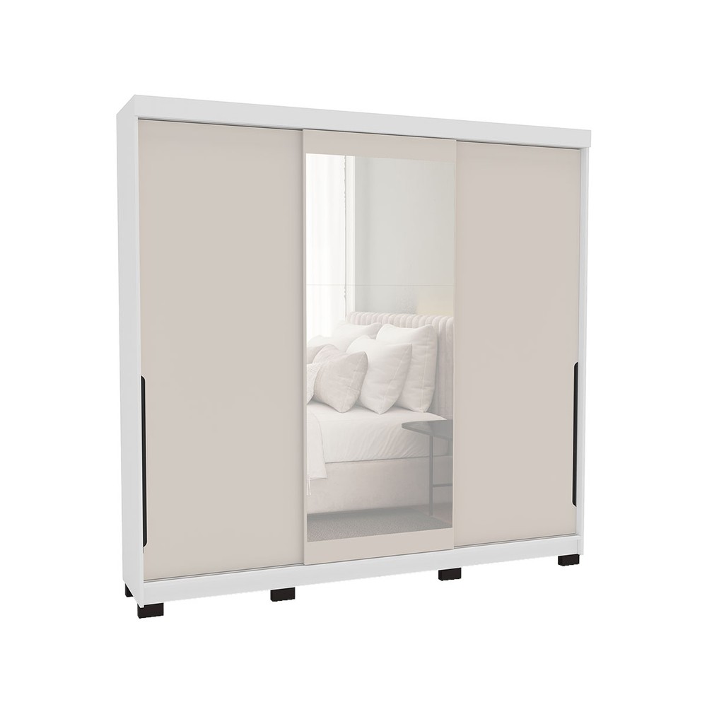 Guarda-Roupa Casal Madrid 3 Portas 4 Gavetas com Espelho Creme/Branco - Politorno