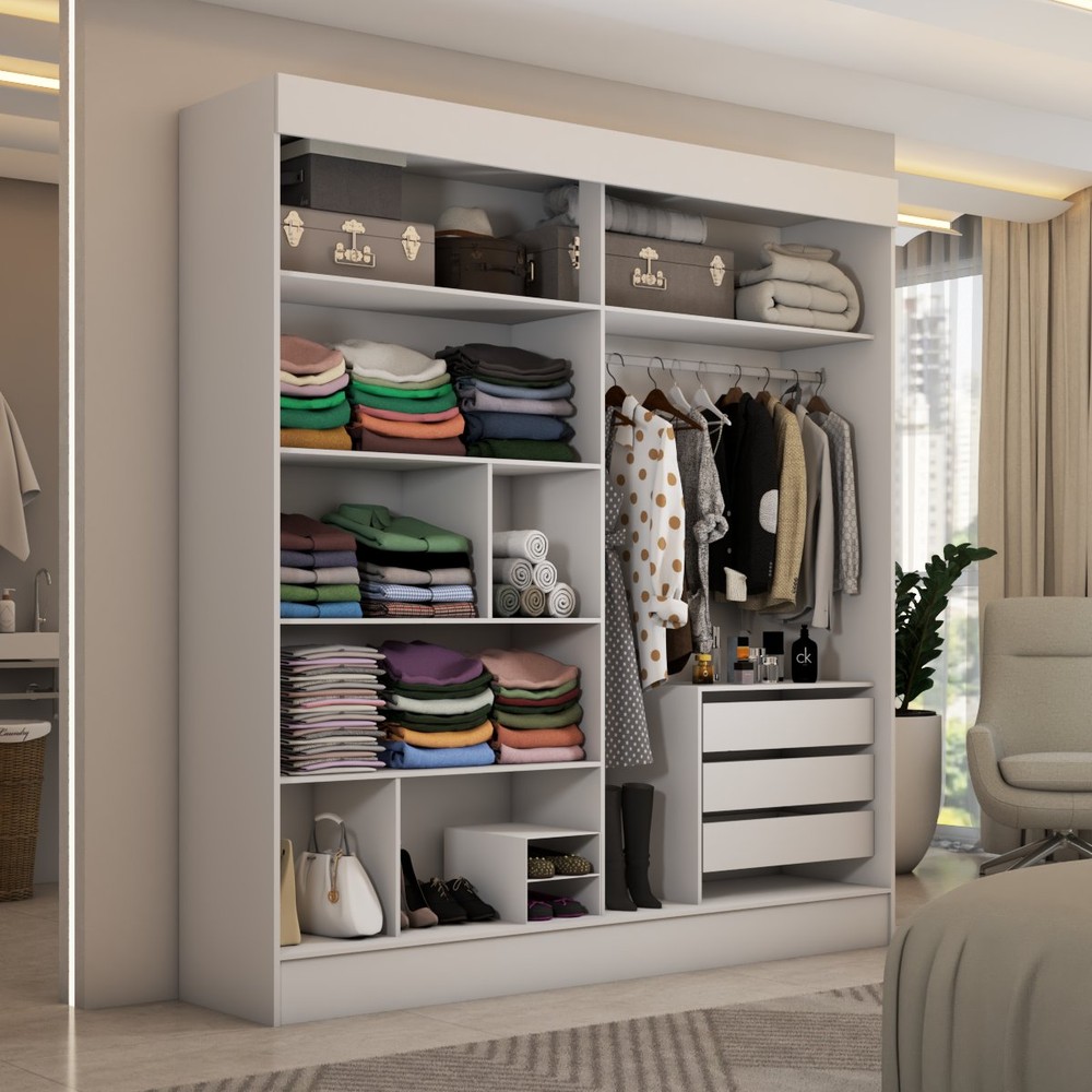 O(a) Guarda-Roupa Casal Portugal 2 Portas de Correr com Espelho 3 Gavetas Branco Fosco - Panorama Móveis é produzido em MDP na escala de brilho Semi-Brilho, e possui um grau de dificuldade de montagem: Médio.