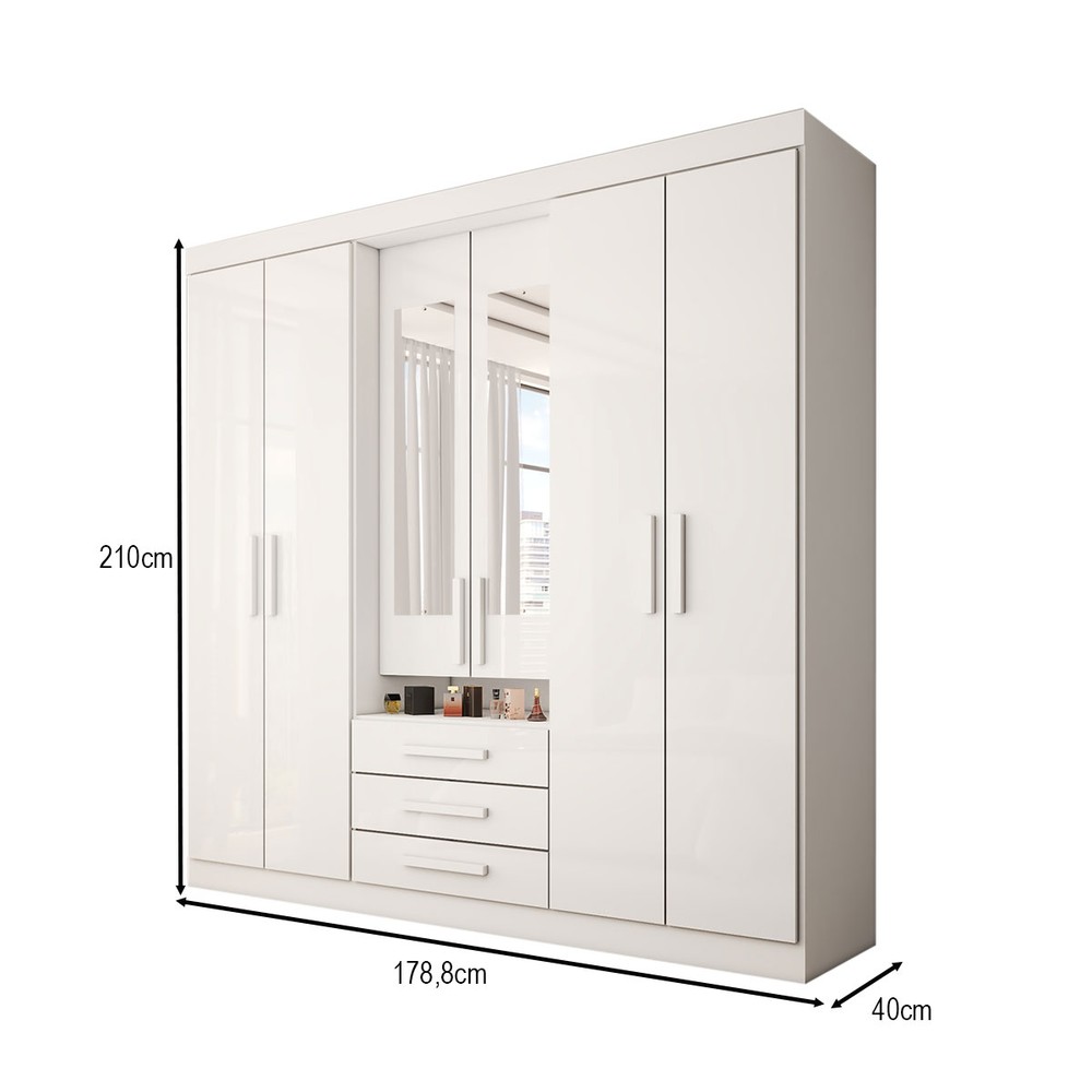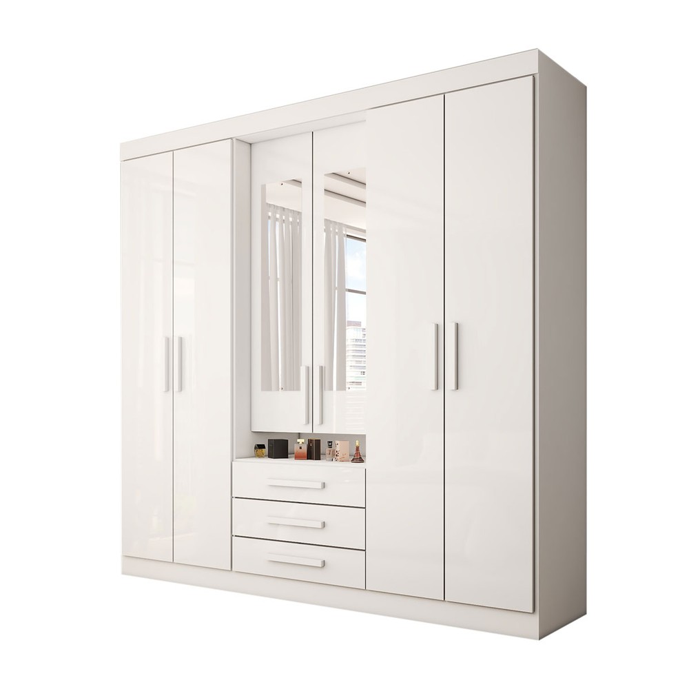 O(a) Guarda-Roupa Casal Real 6 Portas 3 Gavetas com Espelho 100% Mdf Branco - Panorama Móveis é produzido em 100% MDF na escala de brilho Brilhante e Semi-Brilho, e possui um grau de dificuldade de montagem: Difícil.