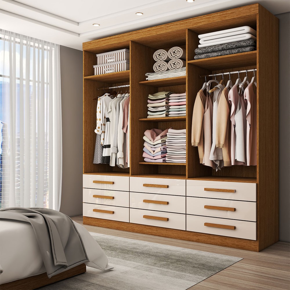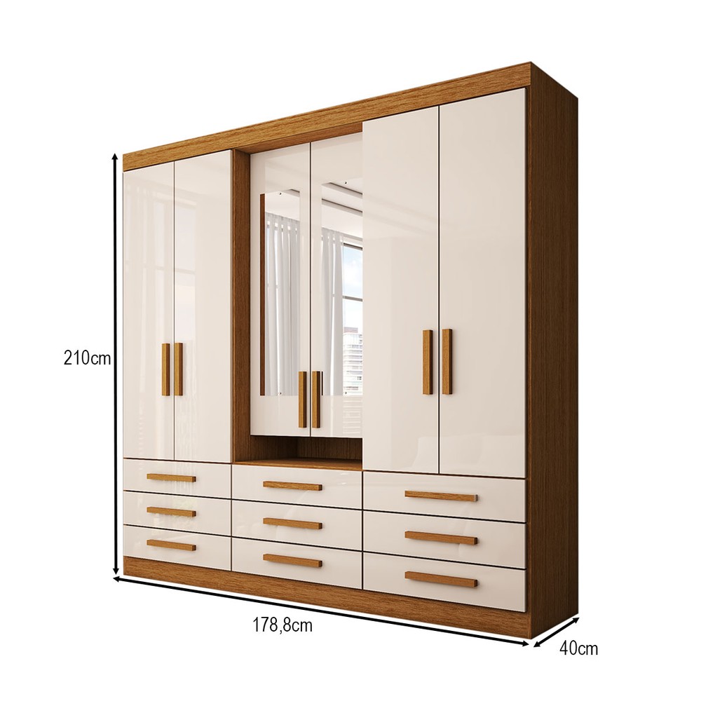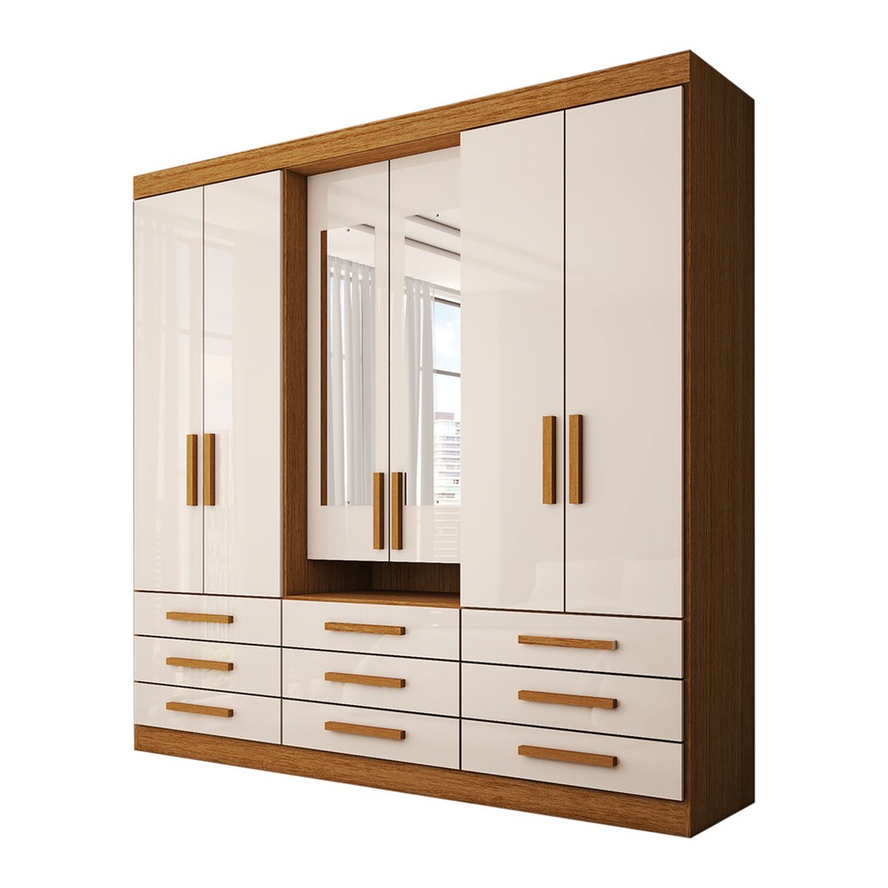 O(a) Guarda-Roupa Casal Real 6 Portas 9 Gavetas com Espelho 100% Mdf Cinamomo/Off White - Panorama Móveis é produzido em 100% MDF na escala de brilho Brilhante e Semi-Brilho, e possui um grau de dificuldade de montagem: Médio.