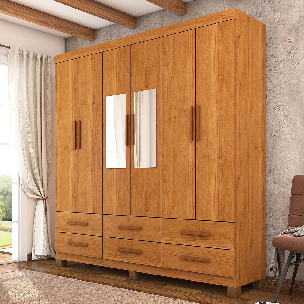 O(a) Guarda-Roupa Solteiro Aria 6 Portas 6 Gavetas com Pés e Espelho Cinamomo - Pnr Móveis é produzido em MDP na escala de brilho Fosco e Semi-Brilho, e possui um grau de dificuldade de montagem: Médio.