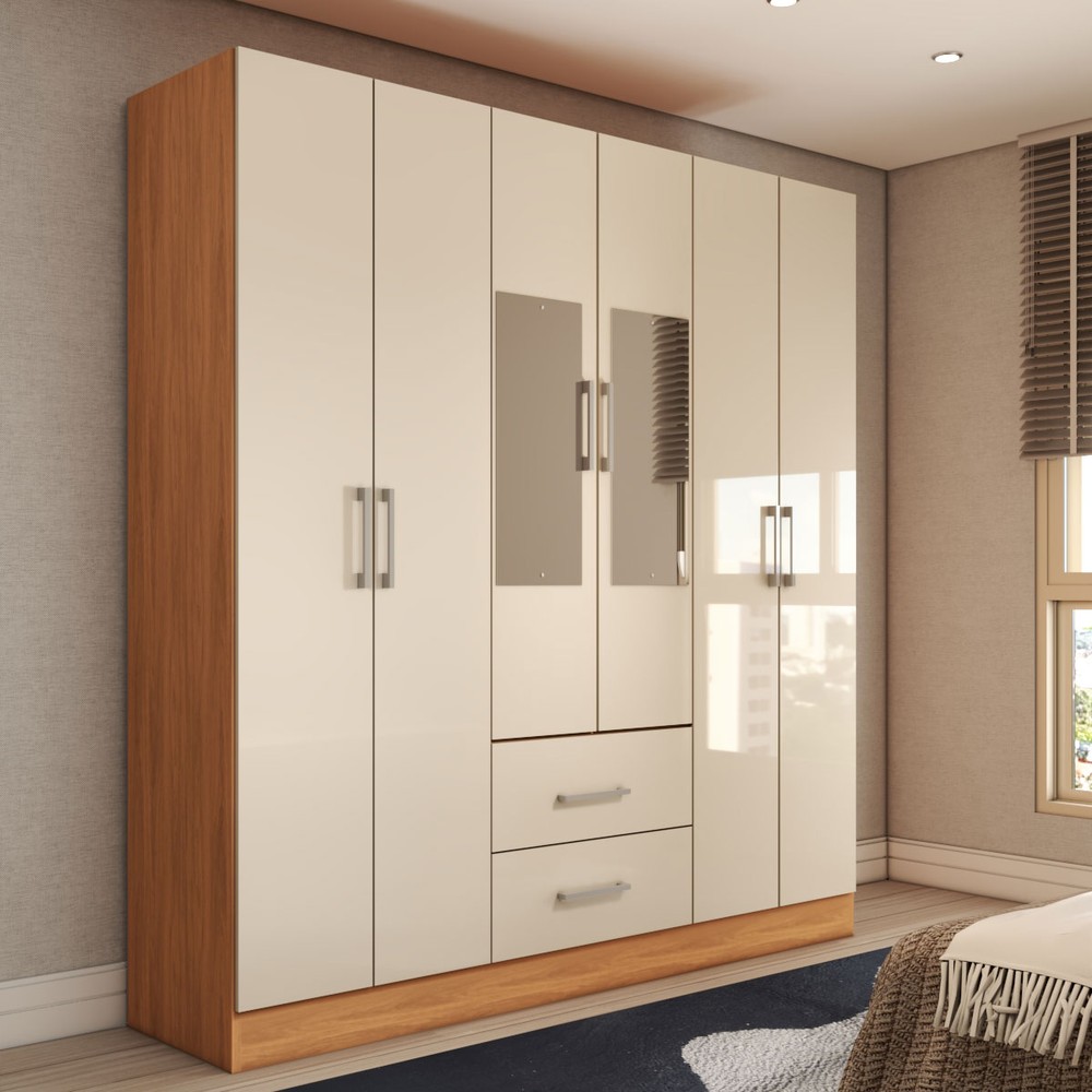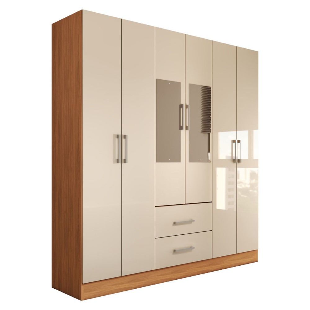 Guarda-Roupa Solteiro Bali 6 Portas 2 Gavetas com Espelho Cinamomo/Off White - Panorama Móveis