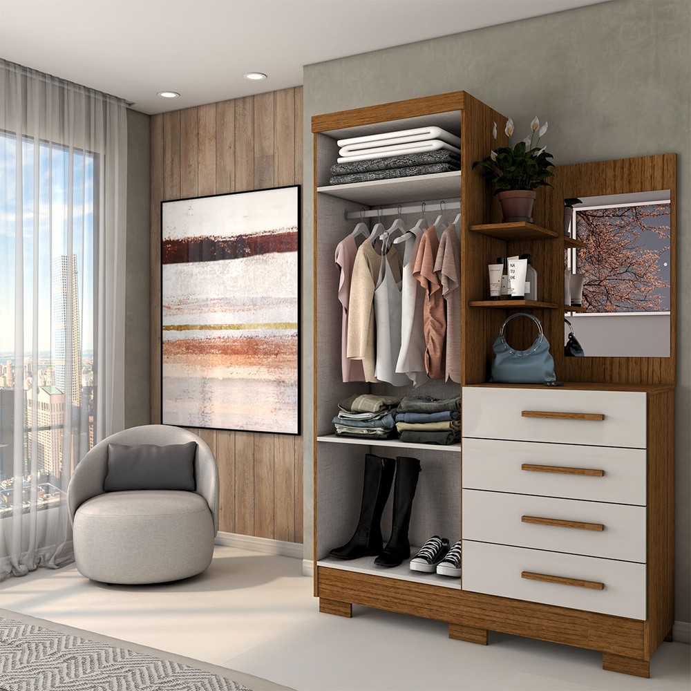 O(a) Guarda-Roupa Solteiro Verona 2 Portas 4 Gavetas com Espelho 100% Mdf Cinamomo/Off White - Panorama Móveis é produzido em 100% MDF na escala de brilho Brilhante e Semi-Brilho, e possui um grau de dificuldade de montagem: Médio.