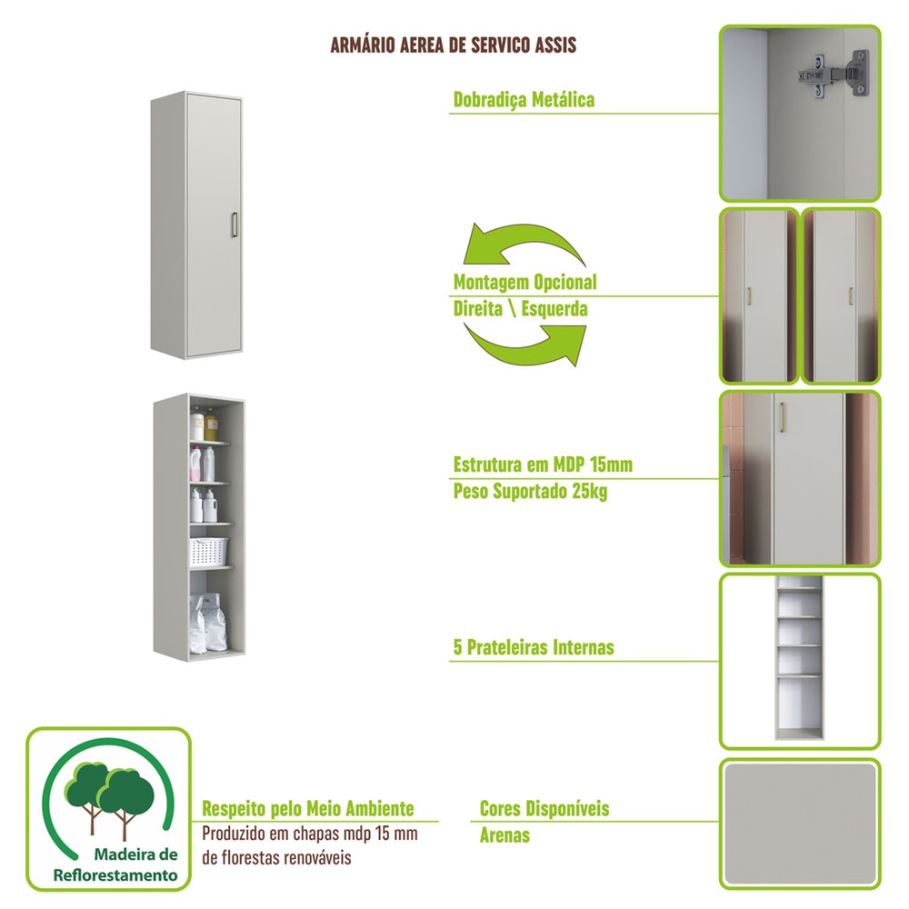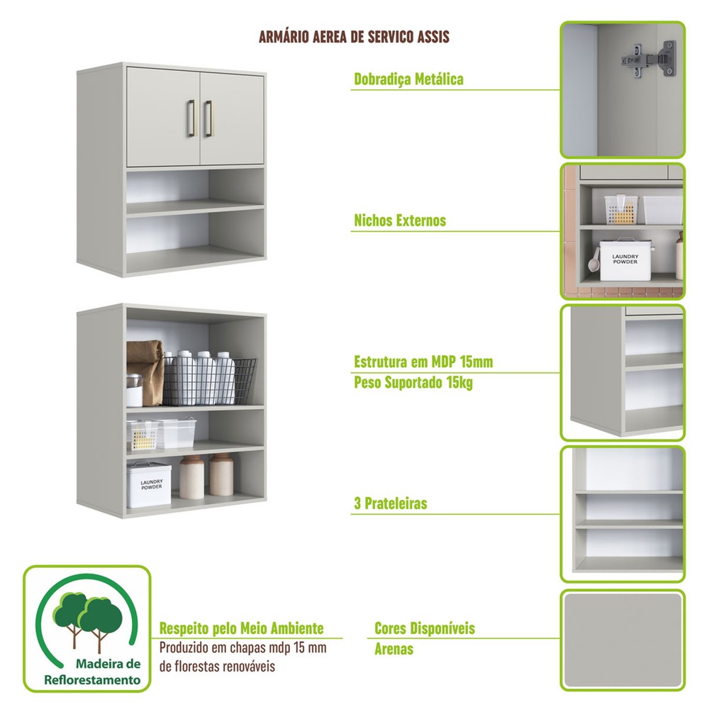 O(a) Lavanderia Completa Assis 4 Portas Arenas - Art In Móveis é produzido em MDP na escala de brilho Fosco, e possui um grau de dificuldade de montagem: Médio.