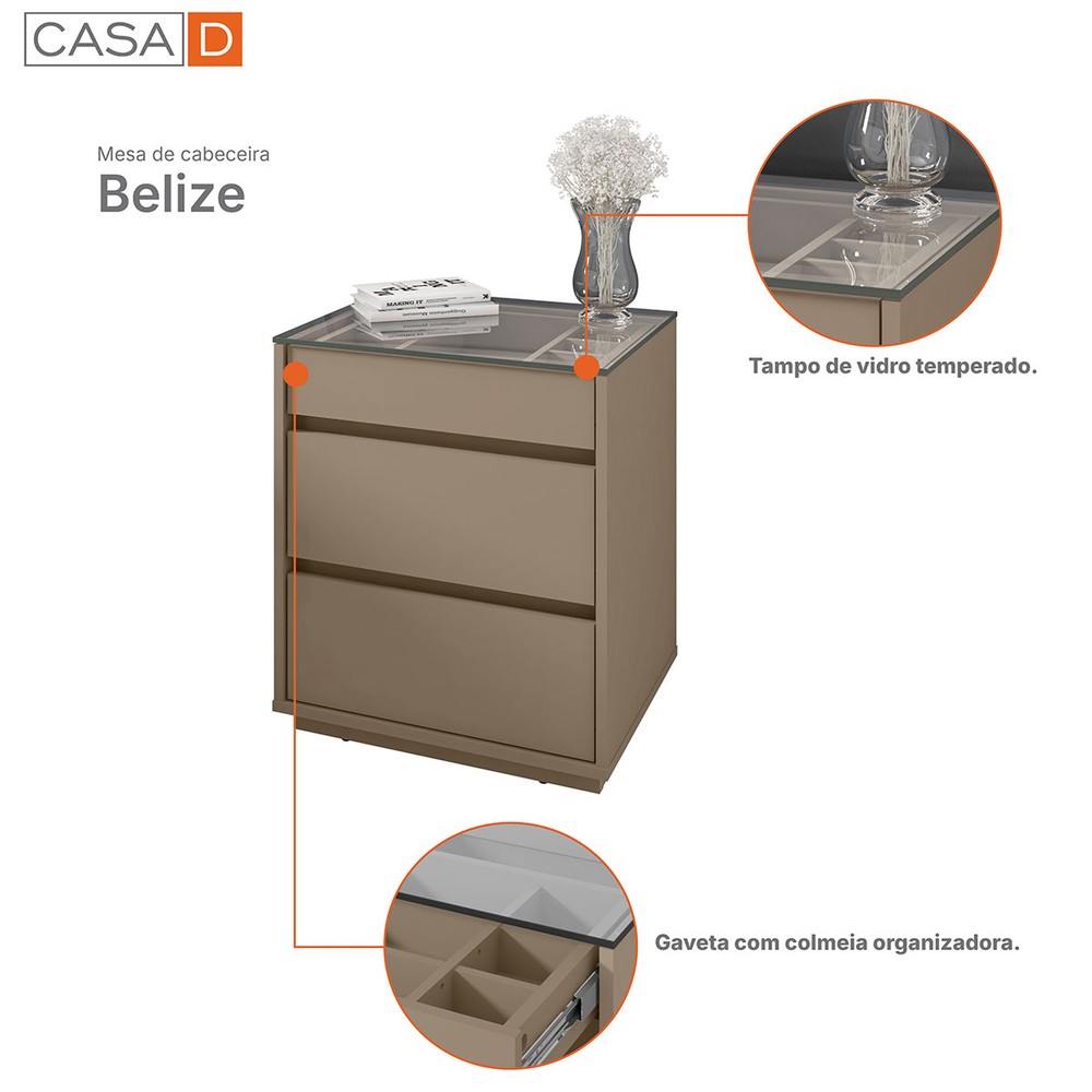 O(a) Mesa de Cabeceira Belize 3 Gavetas Fendi - Casa D é produzido em MDP/MDF na escala de brilho Semi-Fosco, e possui um grau de dificuldade de montagem: Médio.