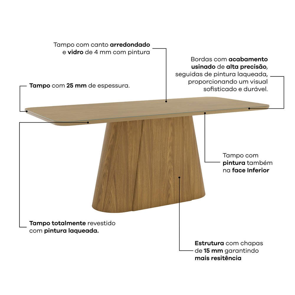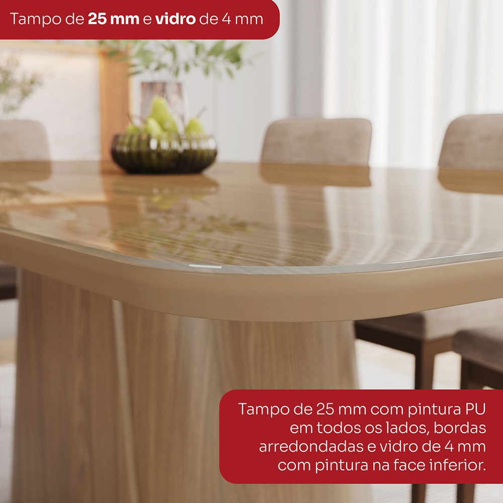 Mesa de Jantar 8 Lugares Olívia 200cm com Vidro Nature/Corano/Caramelo/Creme - Henn