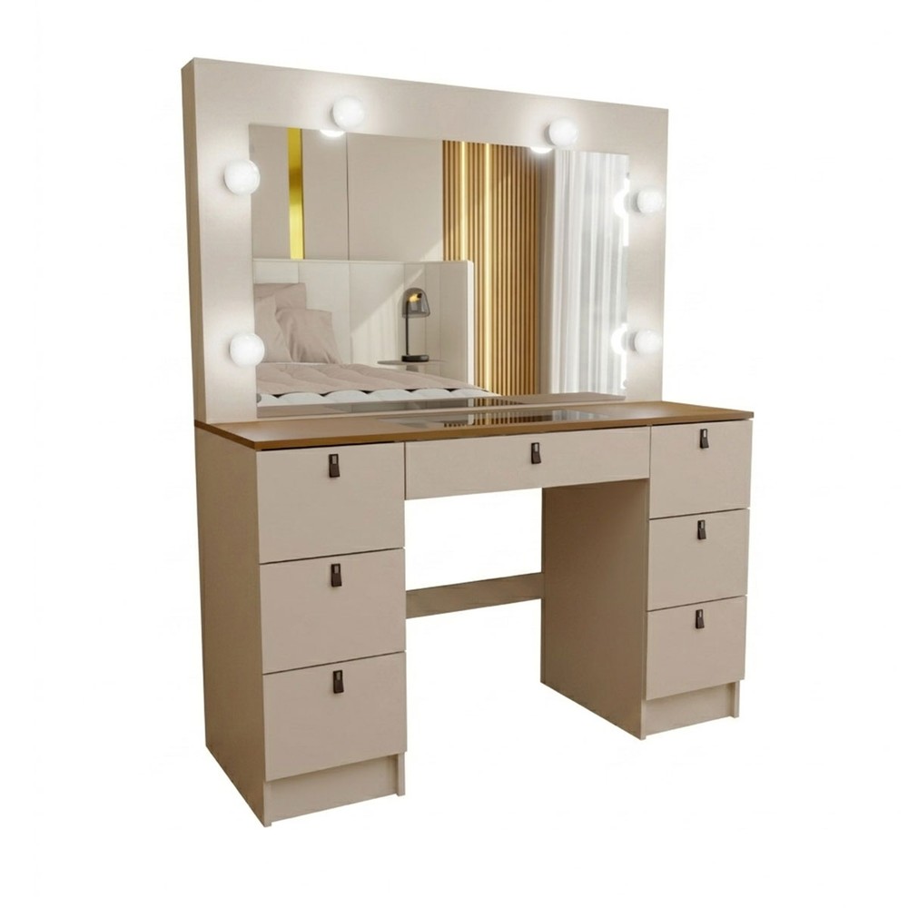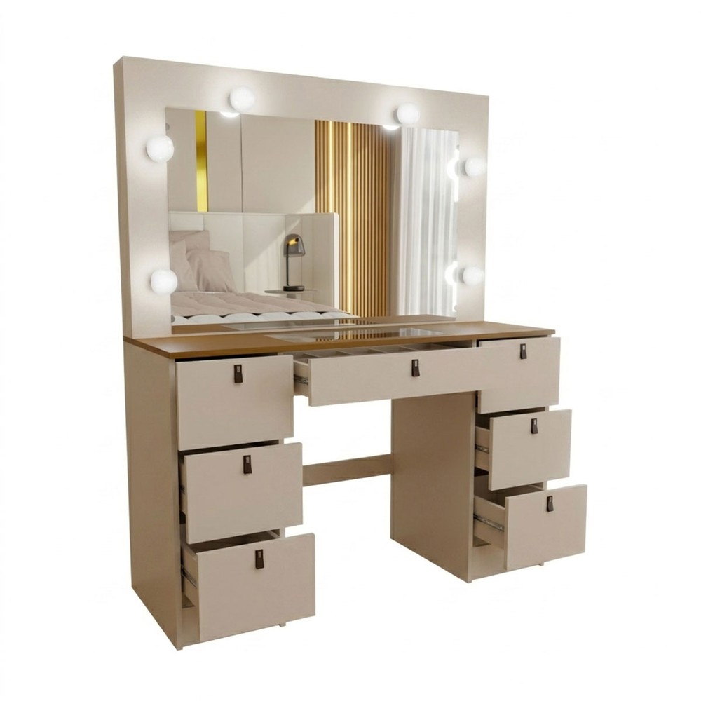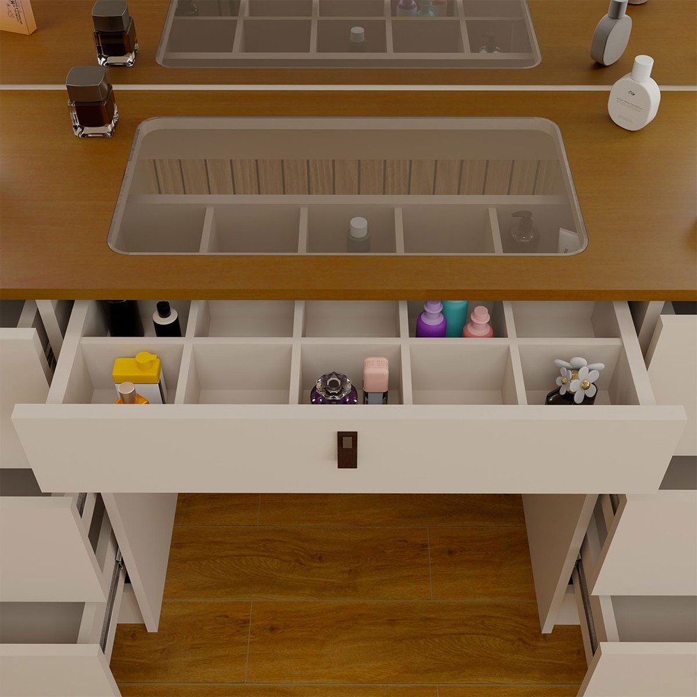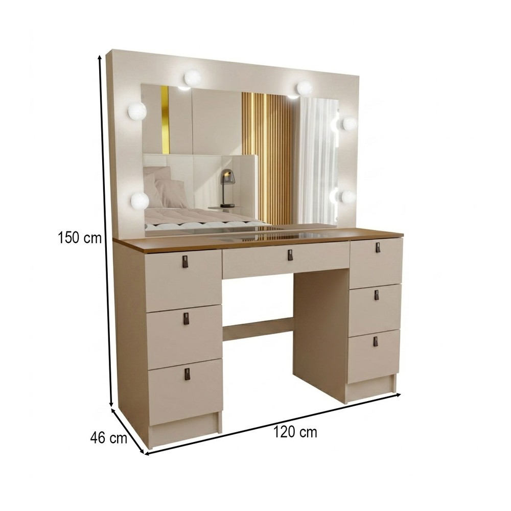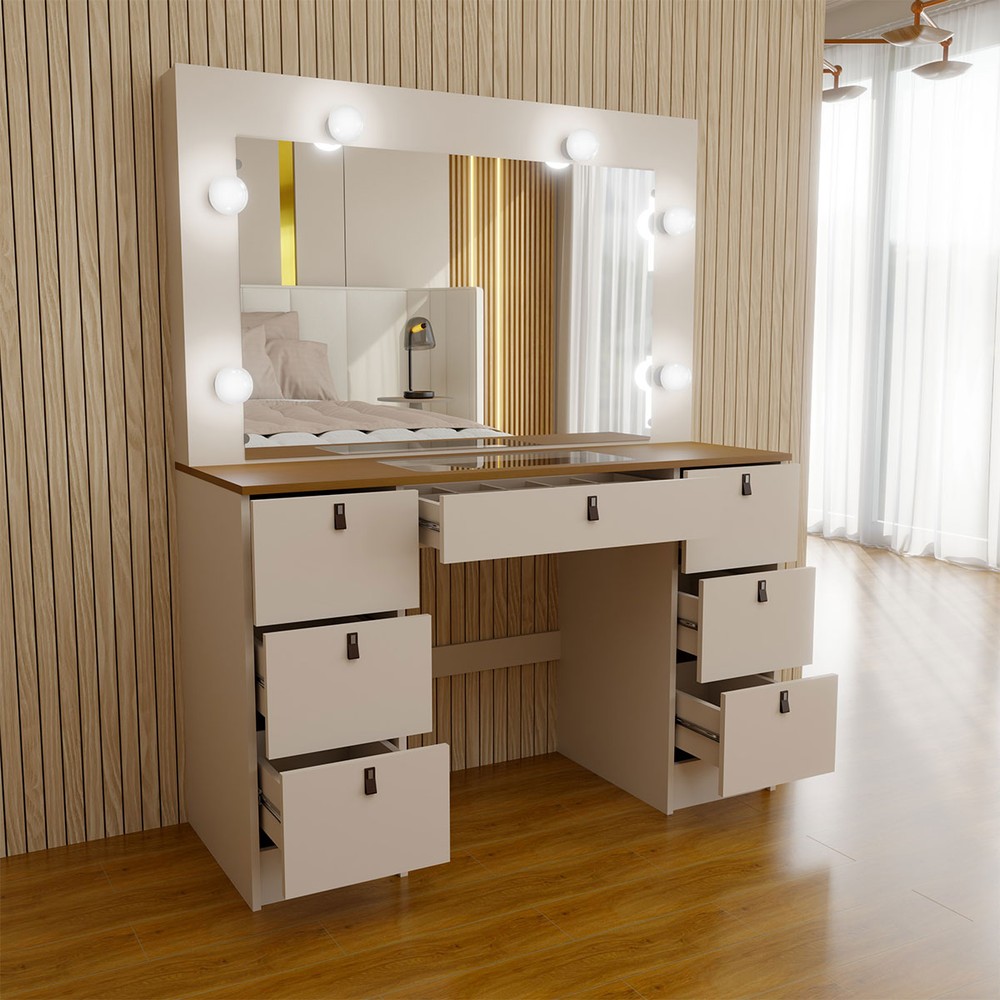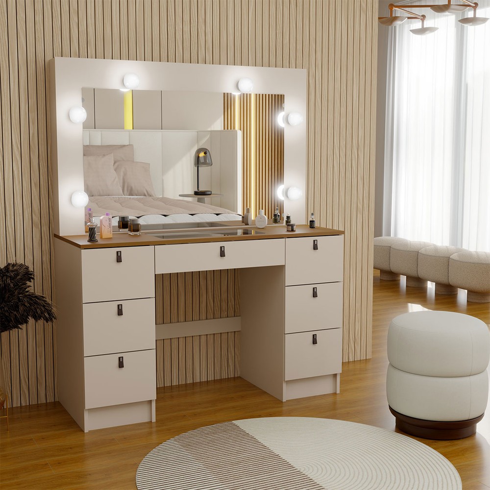 O(a) Penteadeira Camarim Yara 7 Gavetas com Espelho Off White/Freijó - Panorama Móveis é produzido em MDP na escala de brilho Semi-Fosco, e possui um grau de dificuldade de montagem: Médio.
