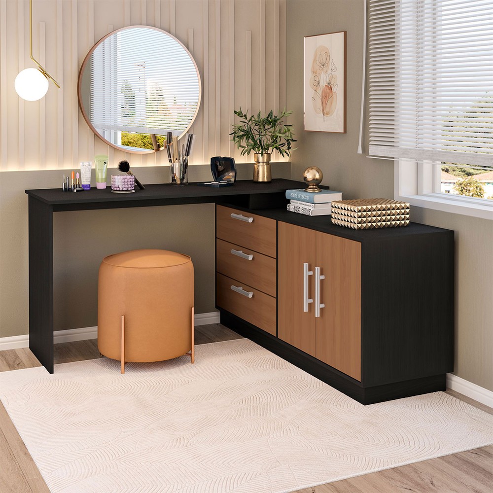 O(a) Penteadeira com Cômoda Rocher 2 Portas 3 Gavetas Preto/Freijó - Pnr Móveis é produzido em MDP na escala de brilho Fosca com Textura, e possui um grau de dificuldade de montagem: Médio.