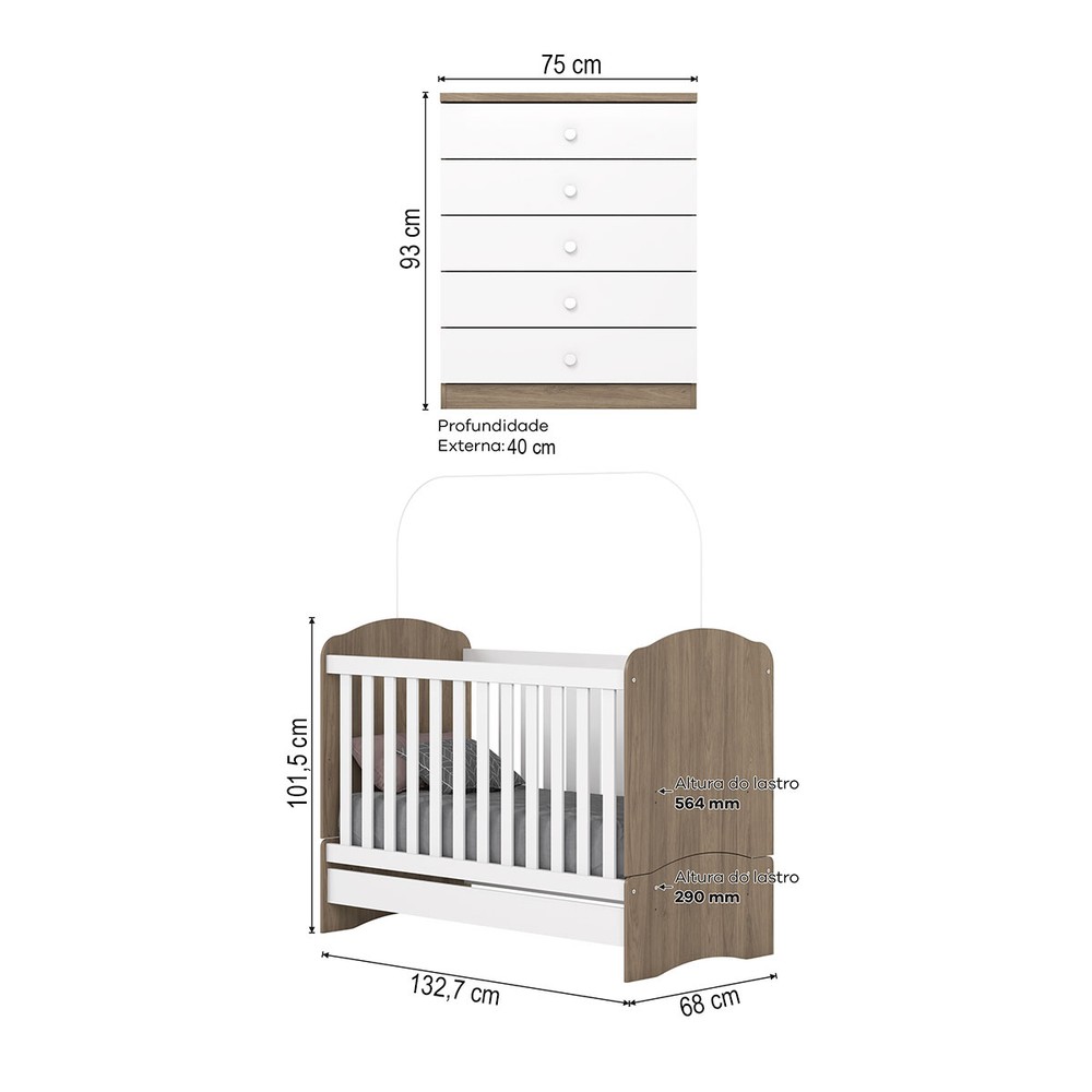 O que compõe Berço (A x L x P) : 101,5 x 132,7 x 68cm Cômoda (A x L x P) : 93 x 75 x 40cm