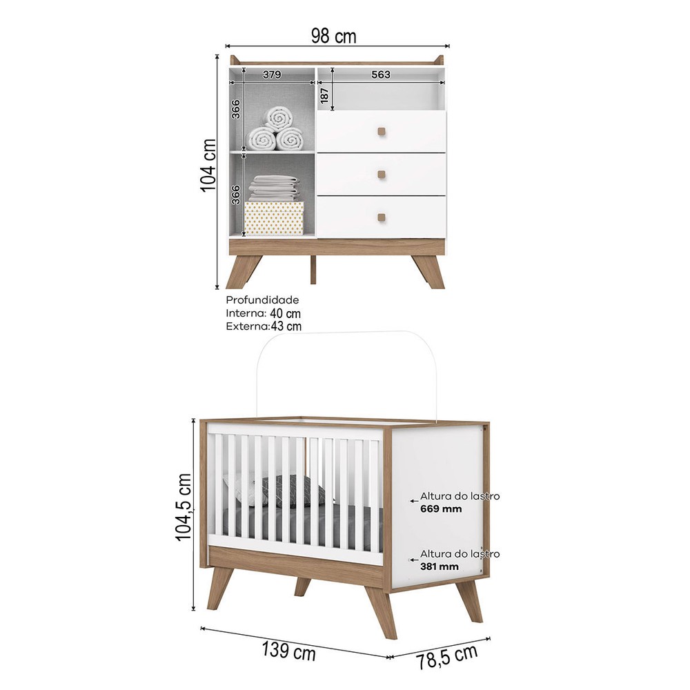 O(a) Quarto de Bebê Completo Confete 1 Porta 3 Gavetas Branco/Jequitibá - Henn é produzido em MDF e MDP na escala de brilho Fosco, e possui um grau de dificuldade de montagem: Médio.