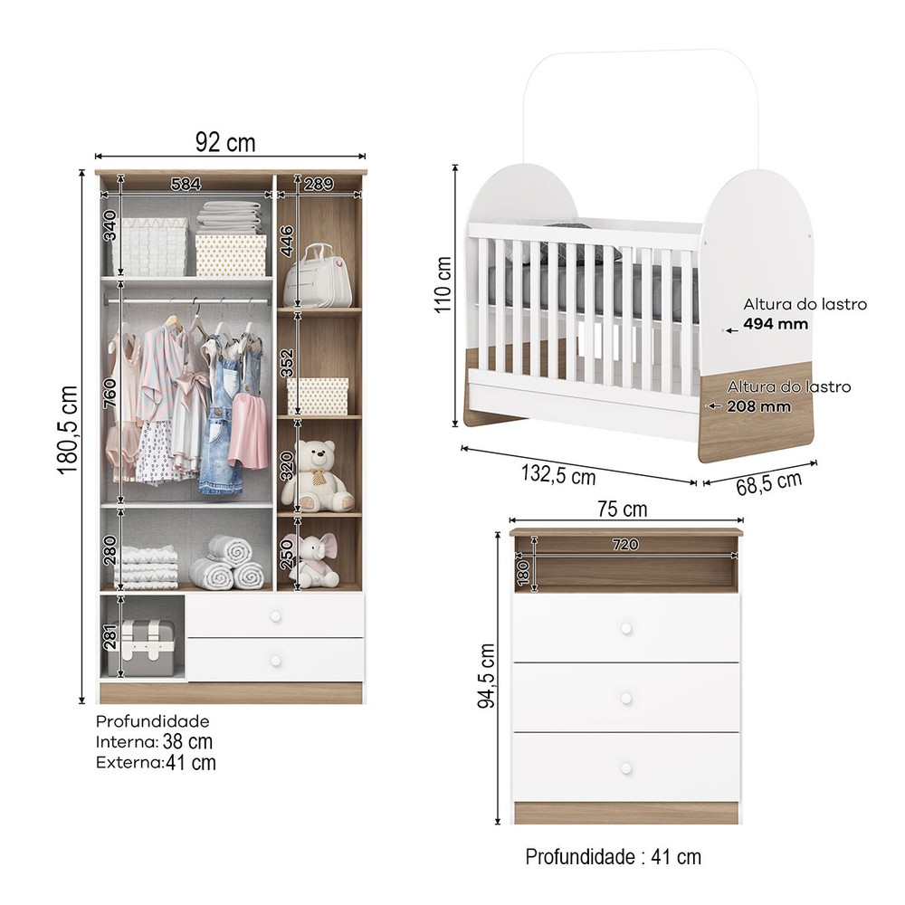 O que compõe Guarda Roupas (A x L x P) : 180,5 x 92 x 41cm Berço (A x L x P) : 110 x 132,5 x 68,5cm Cômoda (A x L x P) : 94,5 x 75 x 41cm