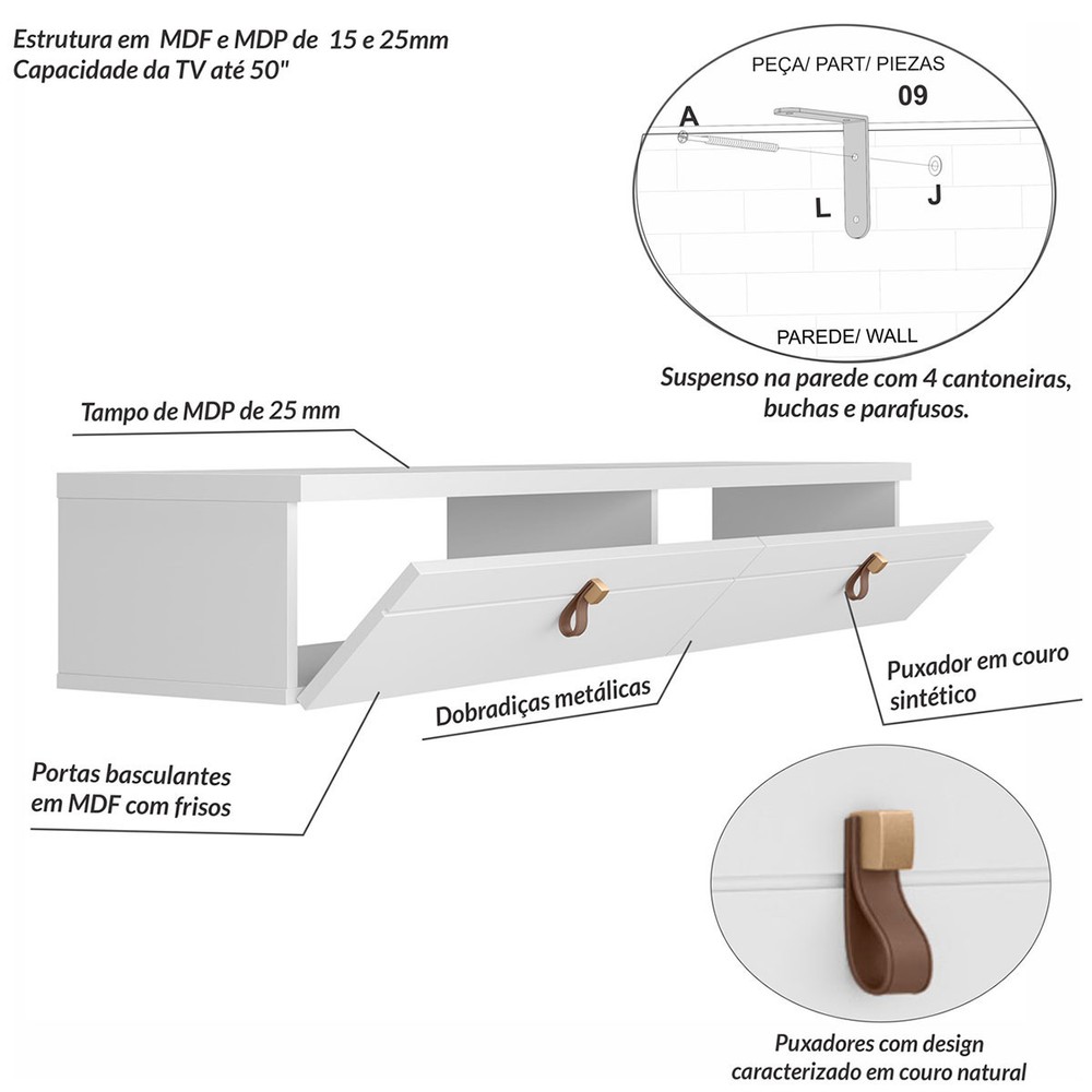 O(a) Rack para TV Até 50 Polegadas Suspenso Imperiale 2 Portas Branco - Pnr Móveis é produzido em MDF e MDP na escala de brilho Semi-Brilho, e possui um grau de dificuldade de montagem: Médio.