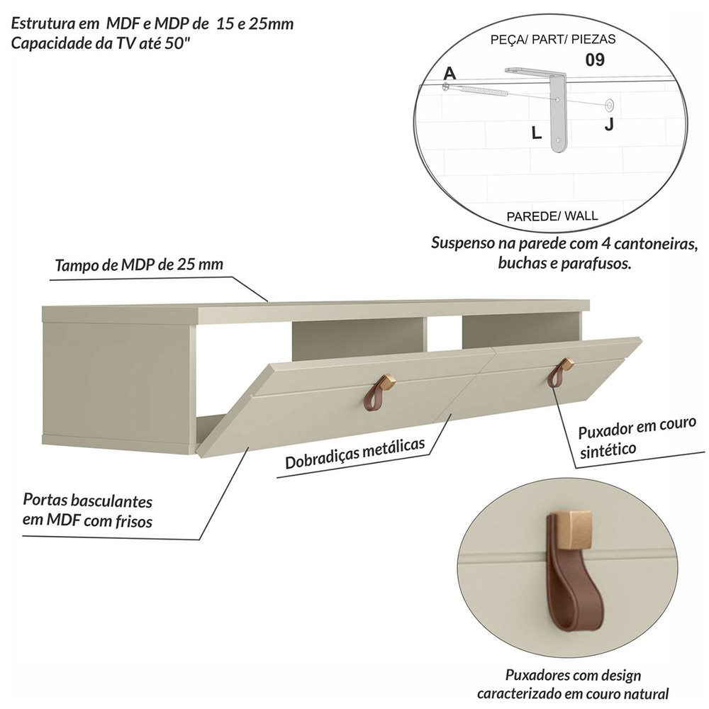 O(a) Rack para TV Até 50 Polegadas Suspenso Imperiale 2 Portas Off White/Bege - Pnr Móveis é produzido em MDF e MDP na escala de brilho Semi-Brilho, e possui um grau de dificuldade de montagem: Médio.