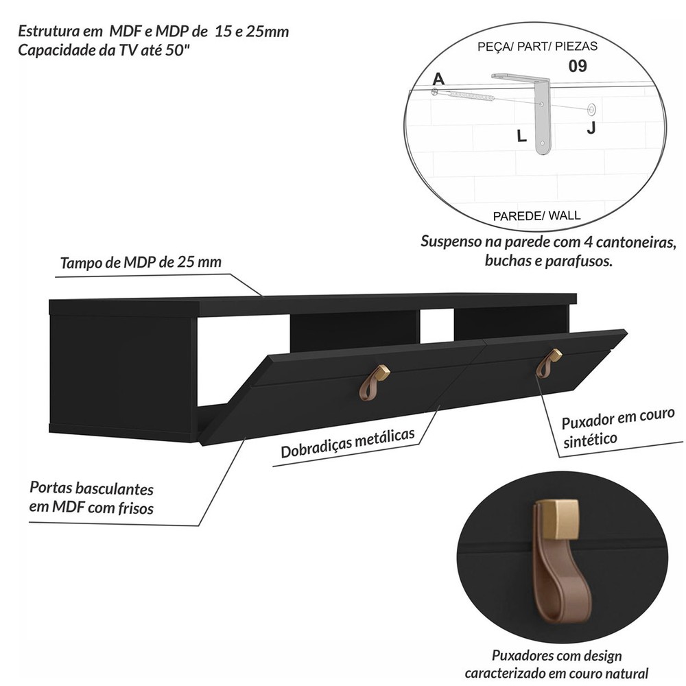 O(a) Rack para TV Até 50 Polegadas Suspenso Line 2 Portas Preto - Olivar Móveis é produzido em MDF e MDP na escala de brilho Semi-Brilho, e possui um grau de dificuldade de montagem: Médio.