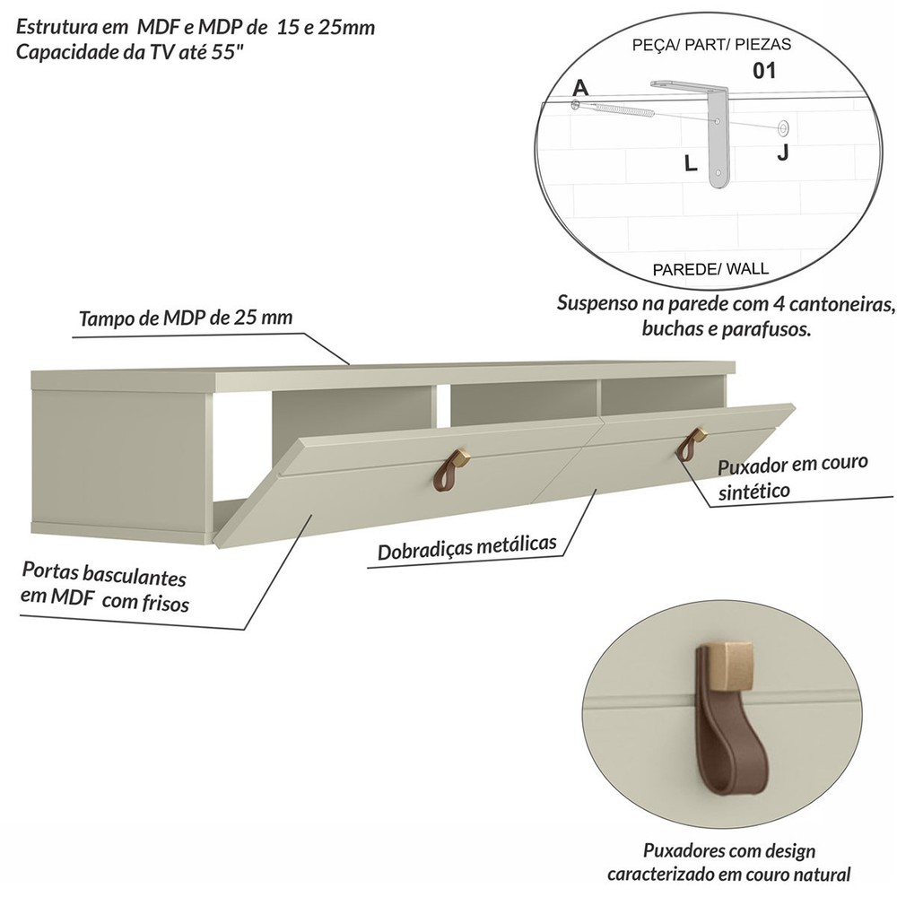 O(a) Rack para TV Até 55 Polegadas Opale 2 Portas Off White/Bege - Pnr Móveis é produzido em MDF e MDP na escala de brilho Semi-Brilho, e possui um grau de dificuldade de montagem: Médio.