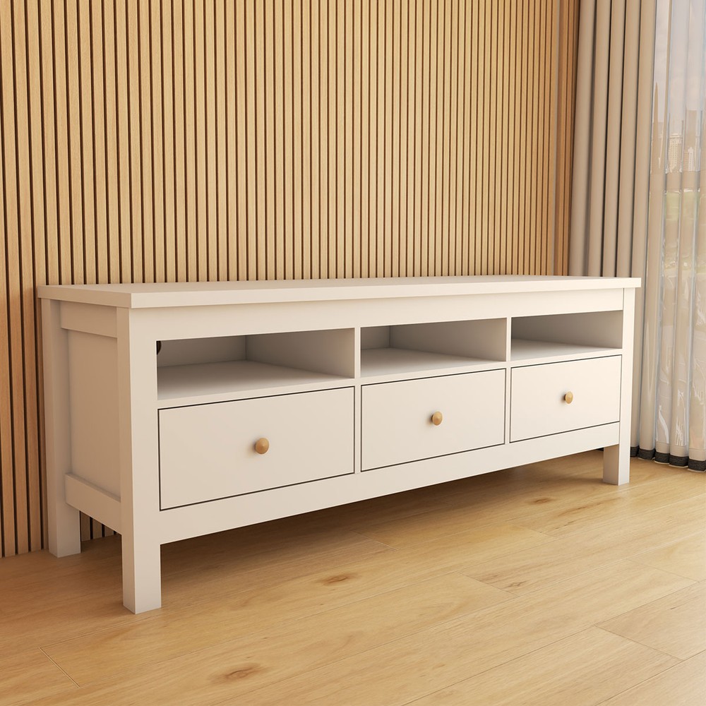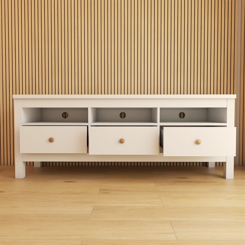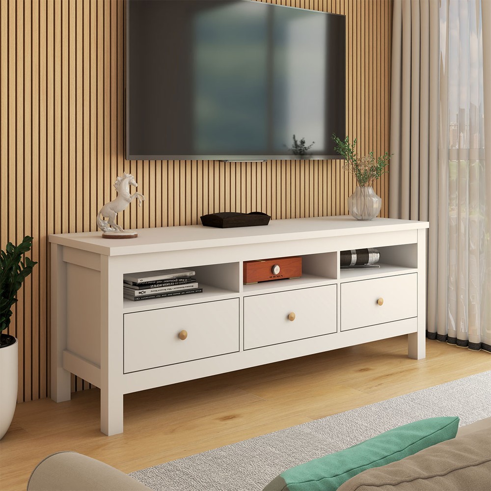 O(a) Rack para TV Até 65 Polegadas Spazio 3 Gavetas Branco - Panorama Móveis é produzido em MDP/MDF na escala de brilho Fosco, e possui um grau de dificuldade de montagem: Médio.
