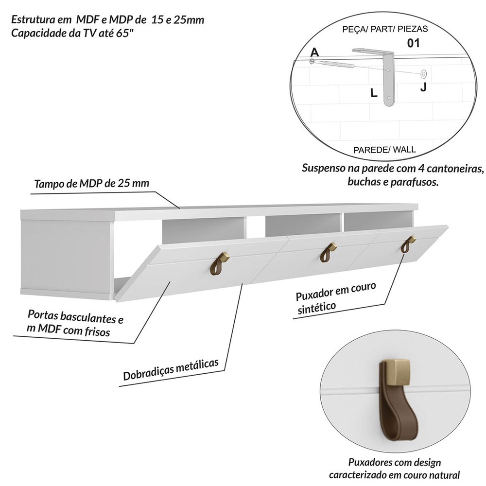 O(a) Rack para TV Até 65 Polegadas Suspenso Zaffira 3 Portas Branco - Pnr Móveis é produzido em MDF e MDP na escala de brilho Semi-Brilho, e possui um grau de dificuldade de montagem: Médio.