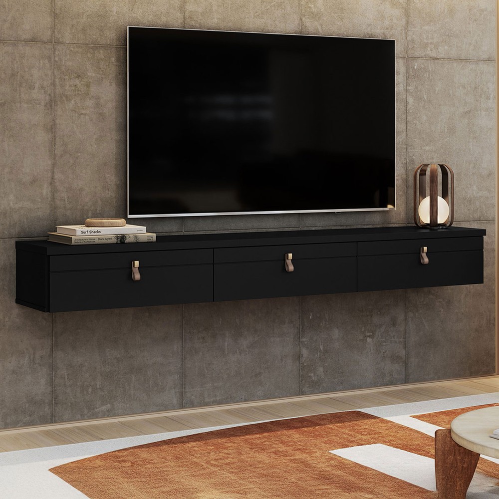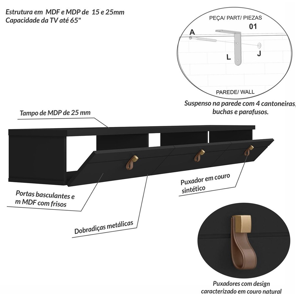O(a) Rack para TV Até 65 Polegadas Suspenso Line 3 Portas Preto - Olivar Móveis é produzido em MDF e MDP na escala de brilho Semi-Brilho, e possui um grau de dificuldade de montagem: Médio.