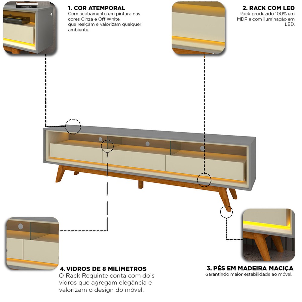 O(a) Rack para TV Até 85 Polegadas Requinte 3 Gavetas 100% Mdf com Pés e Led Cinza/Off White - Gelius é produzido em 100% MDF na escala de brilho Semi-Fosco, e possui um grau de dificuldade de montagem: Médio.