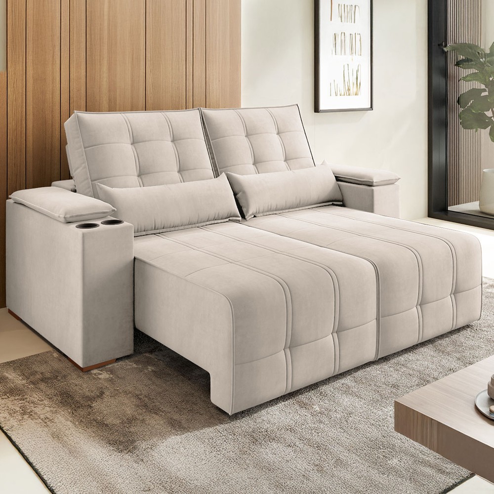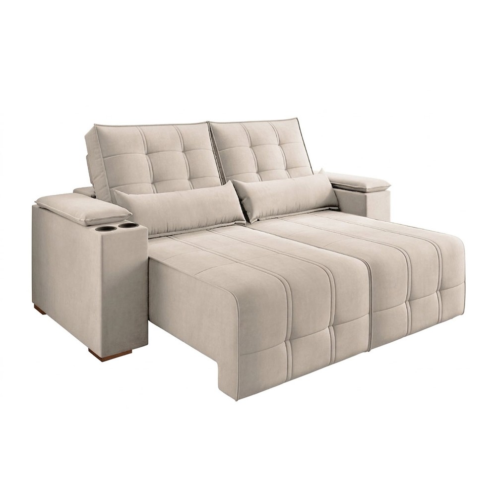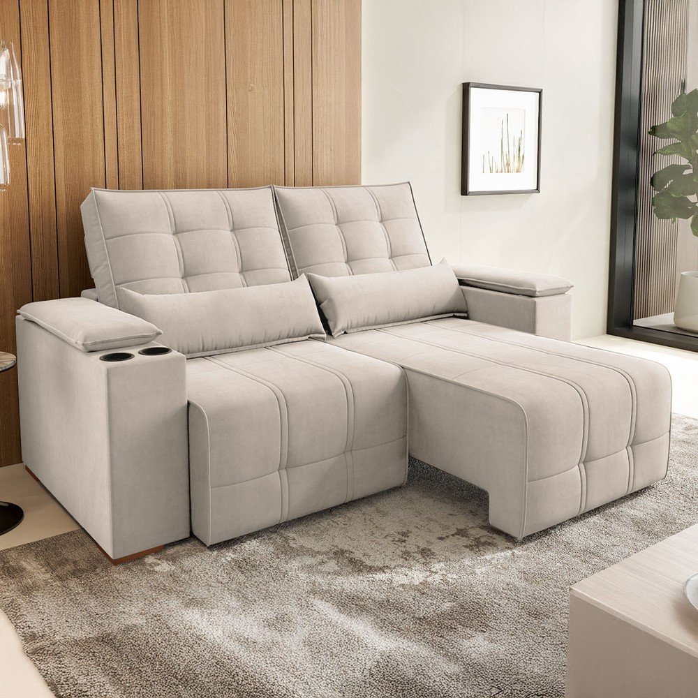 Sofá 3 Lugares Salles Retrátil e Reclinável Veludo com Porta Copos Marfim - Vian